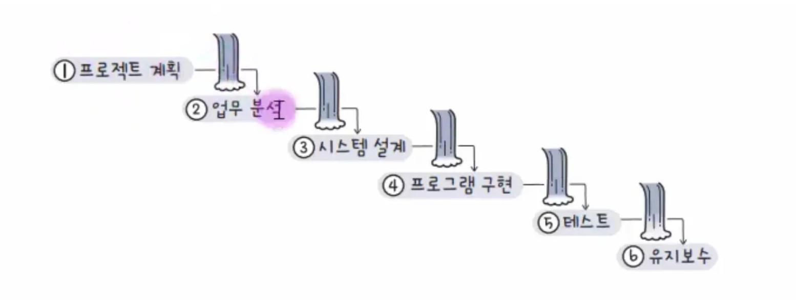 - 대표적으로 ‘폭포수 모델(waterfall model)을 사용