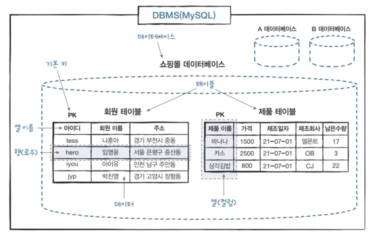 : DBMS, 열, 열 이름, 데이터 형식, 행 등을 포함한다.