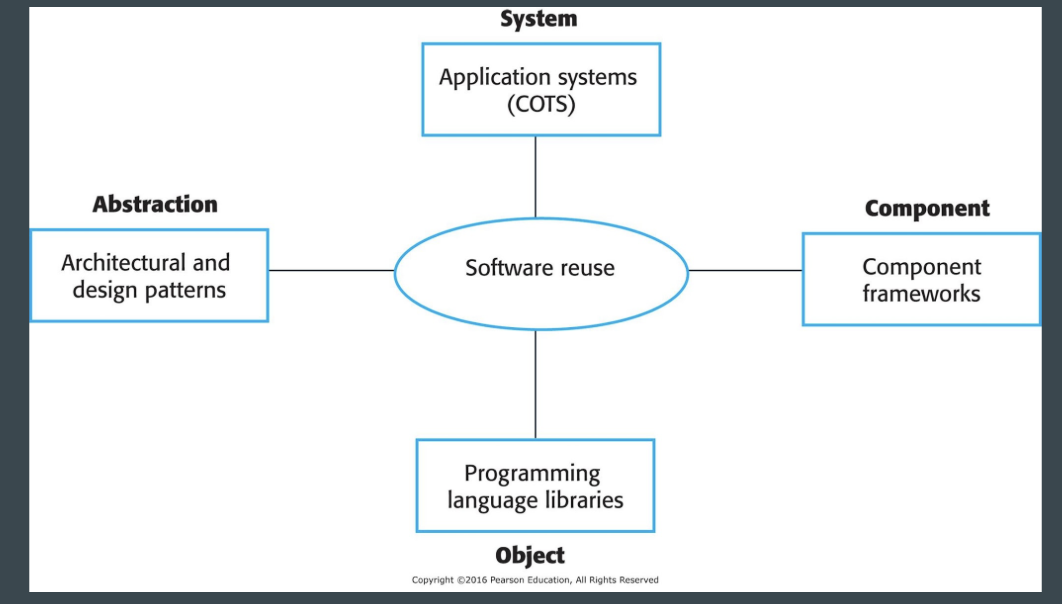 - 소프트웨어를 개발할 때는 기존 소프트웨어를 컴포넌트, 서비스 또는 전체 시스템으로 재사용할 가능성을 항상 고려해야 한다.