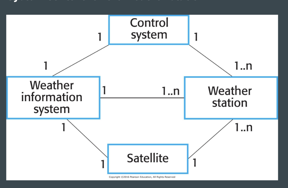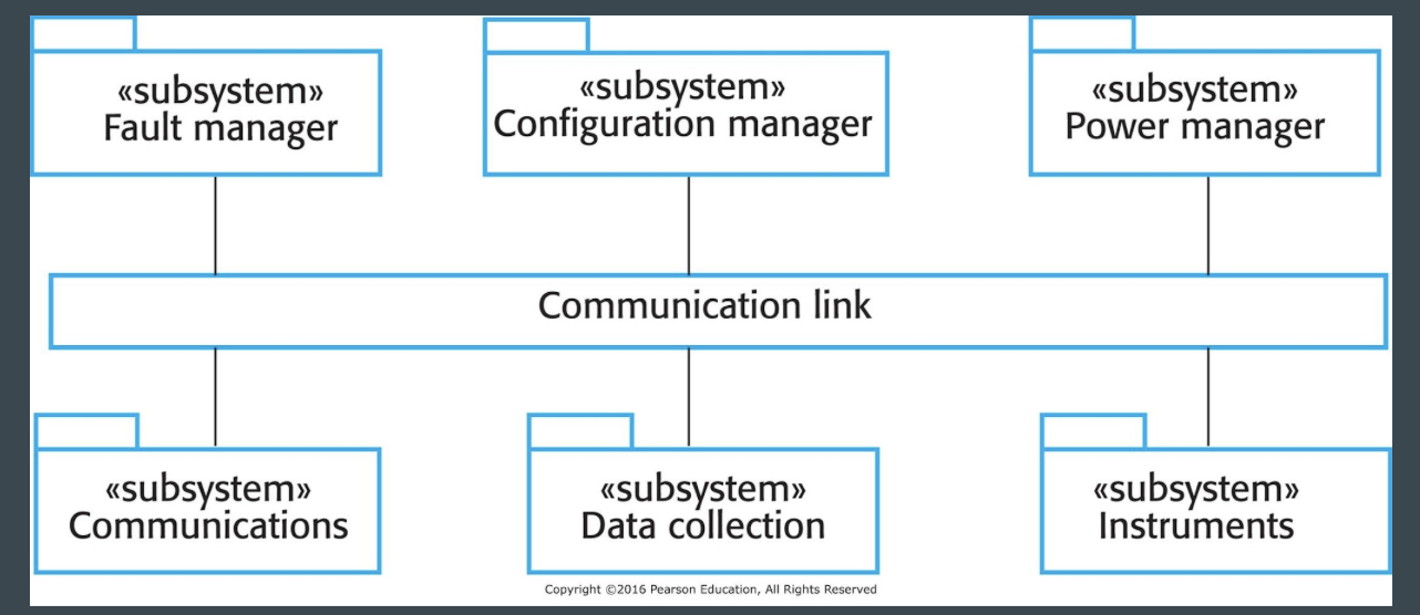 (시스템을 구성하는 주요 컴포넌트와 그 상호작용을 식별하고, 계층형 모델이나 클라이언트-서버 모델과 같은 아키텍처 패턴을 사용해 컴포넌트를 조직화할 수 있다.) - The weather station is composed of independent subsystems that communicate by broadcasting messages on a common infrastructure.