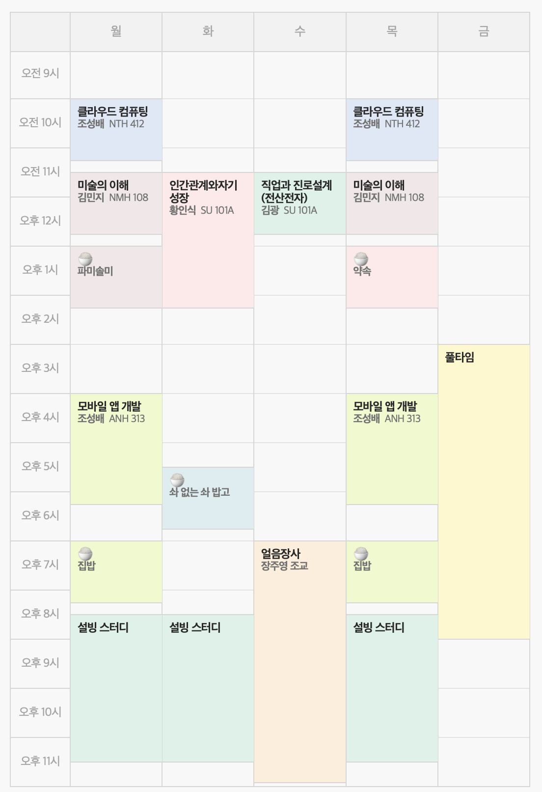 이 사진은 다음 학기 시간표다. 뭔가 많아서 복잡해 보일 수 있지만, 사실 별거 없다. 전공 2과목, 교양 2과목을 듣게 된다. 월요일과 화요일, 목요일에만 학교를 들어가면 되고, 동아리나 학회 등 다른 일정도 없다. 그래서 사실상, 조금은 여유로운 오후를 보내게 되고, 수요일과 금요일은 알바를 제외하면 큰 일정이 없다. 어쩌면 비로소 잘 놀 수도 있고, 내가 세운 목표에 몰입할 수도 있는 최적의 학기라고 생각한다. 널널하니깐 쉽게 생각하고 방심하자는 의미는 아니다. 널널한 순간들이 있기에, 이 널널함을 더욱 알차고 의미 있게 보내고 싶은 마음이 든다.
