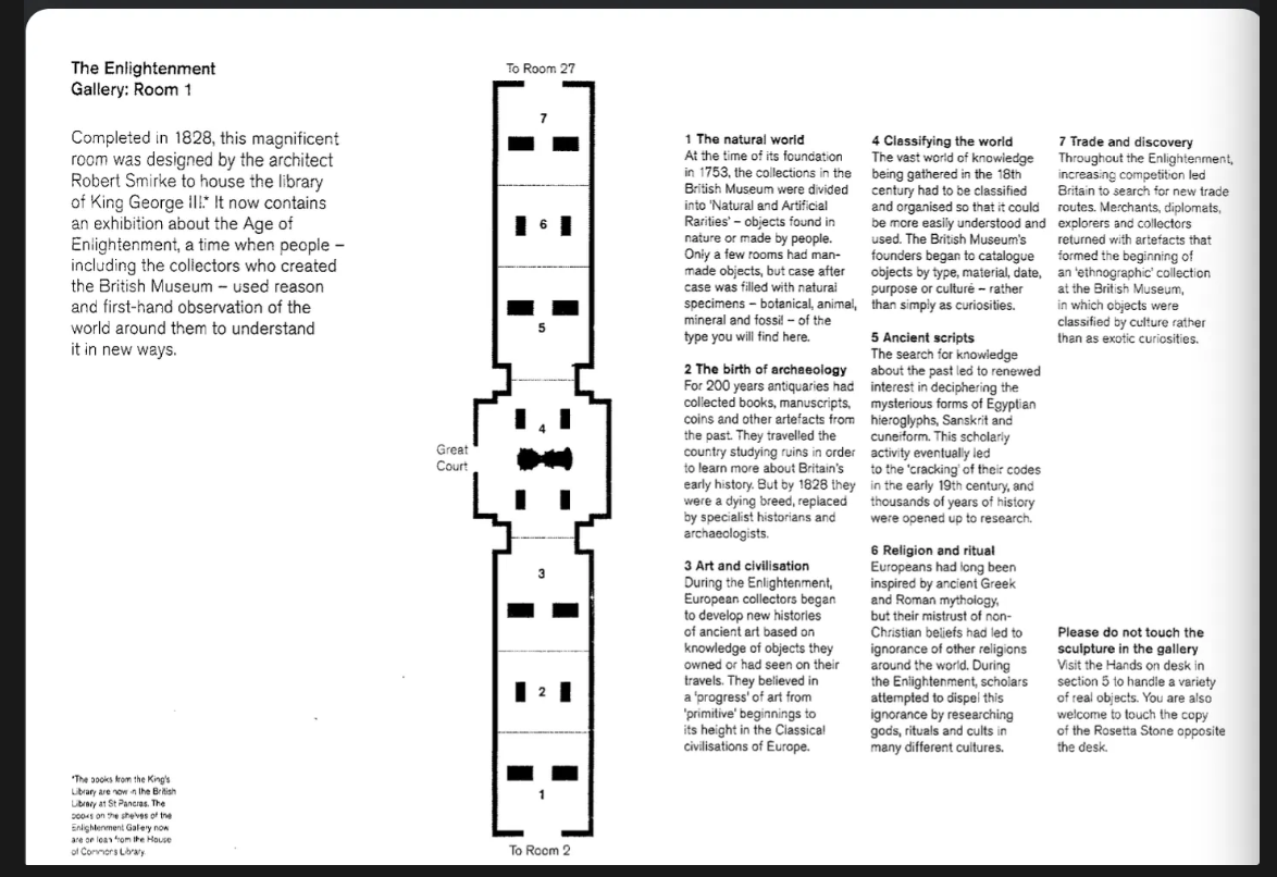 이 사진은 계몽주의(Enlightenment) 전시관에 대한 팜플렛 중 한 면이다. 해당 전시관에서는 즉, ‘이성, 지식, 과학의 힘으로 세상을 이해하려는 시대’의 흐름 속에서 사람들이 어떻게 ‘지식’을 수집하고 정리했는지를 보여주는 전시를 볼 수 있다.