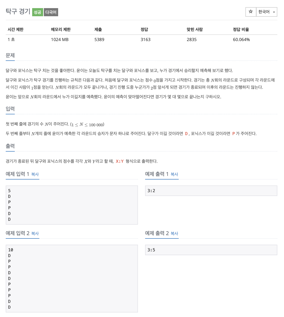 : 입력 값을 바탕으로 달구와 포닉스의 점수를 X:Y 형식으로 출력한다.